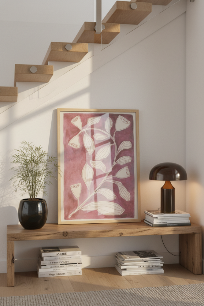 Esta obra captura la elegancia de una rama floral en tonos crema, delicadamente delineada sobre un fondo magenta profundo. El contraste entre las líneas sutiles de las hojas y las flores con el fondo vibrante crea una sensación de calma y sofisticación, ideal para espacios que buscan un toque natural y refinado.