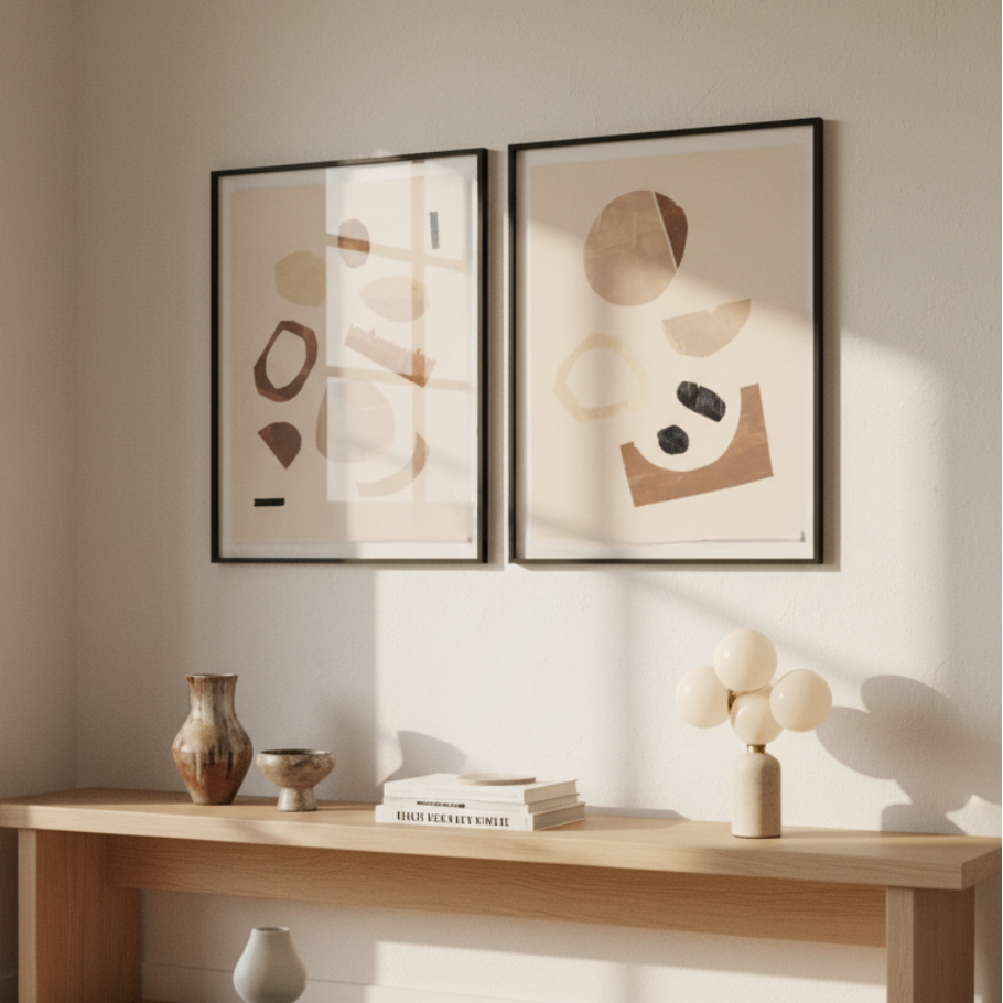 Con un diseño ligero y aireado, esta obra presenta un conjunto de formas abstractas en tonos cálidos y neutros. Figuras irregulares como óvalos y semicirculares se distribuyen de manera delicada sobre un fondo beige, creando un equilibrio visual relajante. La textura sutil de las formas añade profundidad, haciendo de este cuadro una pieza ideal para espacios que buscan un estilo contemporáneo con toques orgánicos.