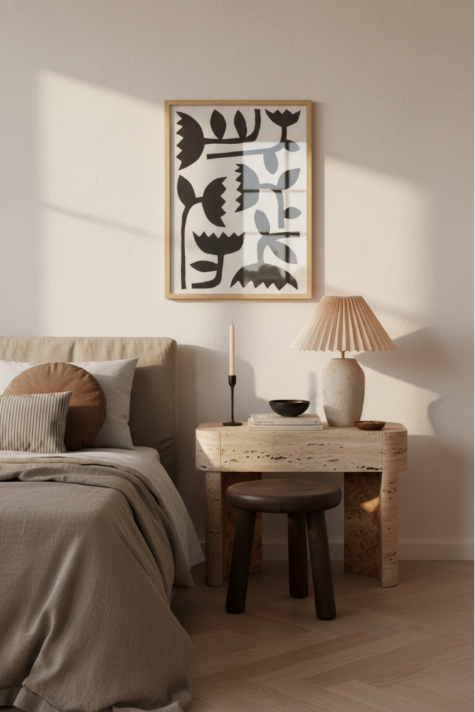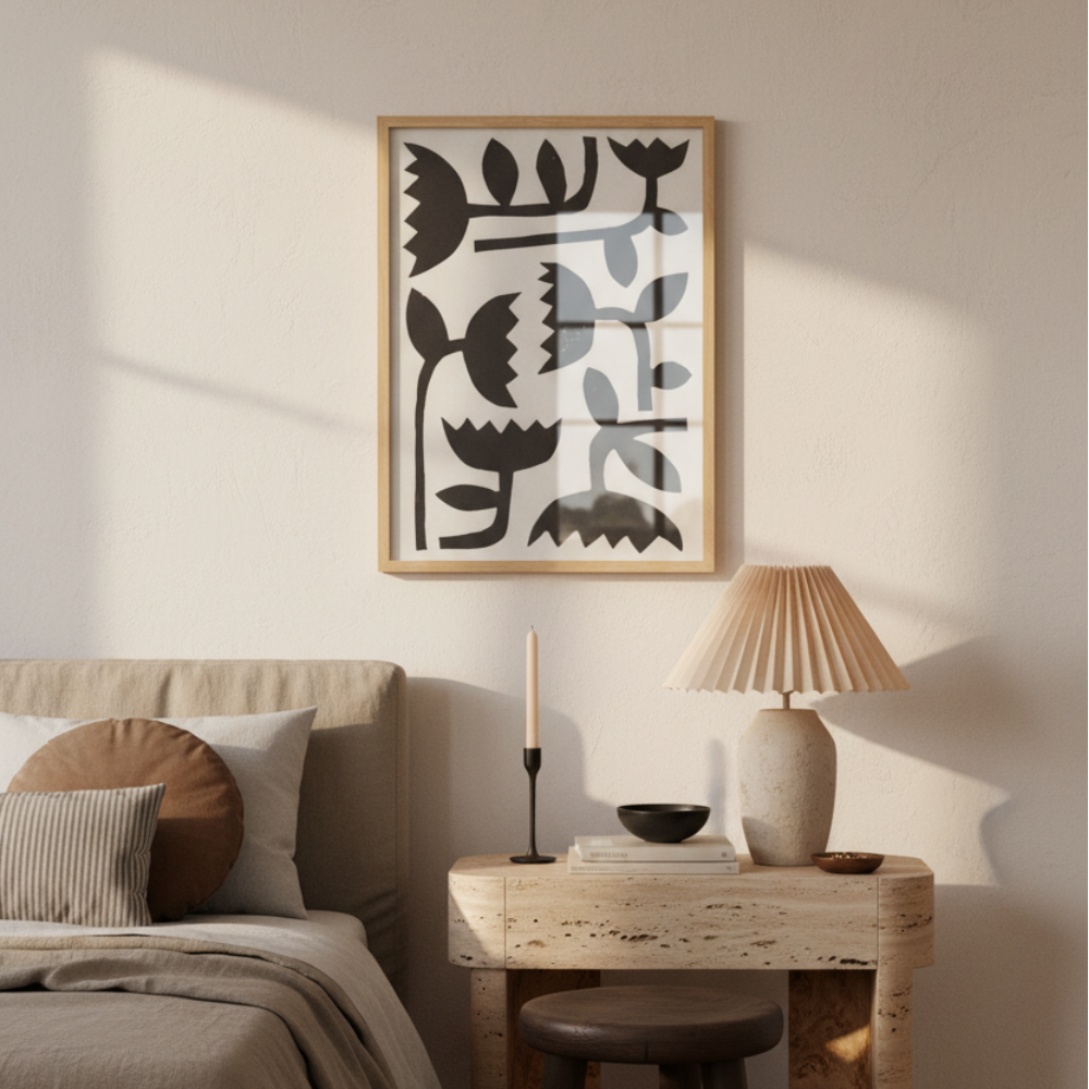 Este cuadro minimalista en blanco y negro utiliza formas geométricas para representar flores estilizadas que remiten al diseño gráfico de mediados del siglo XX. Las figuras, con pétalos dentados y tallos angulosos, evocan el estilo de recorte en papel o stencil, típico del arte modernista. Su paleta monocromática lo hace versátil para cualquier espacio, desde un comedor contemporáneo hasta una oficina de estilo escandinavo o un pasillo con decoración tipo Bauhaus.