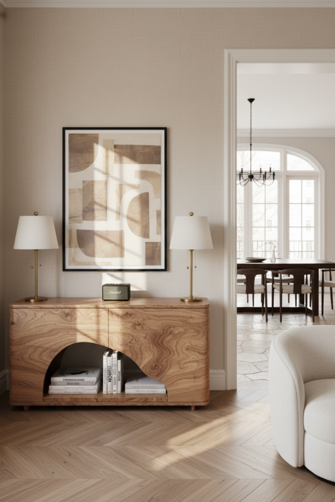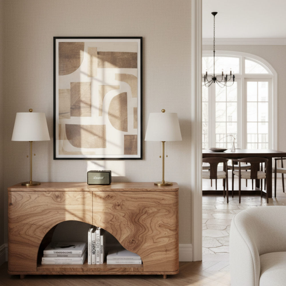 Con una paleta cálida de tonos marrones y beige, esta obra abstracta presenta un diseño arquitectónico que evoca planos y estructuras urbanas. Los bloques curvados y rectangulares están distribuidos de manera equilibrada, lo que crea un efecto visual armónico. La textura mate y las formas suavemente delineadas añaden profundidad, haciendo de esta pieza una elección ideal para interiores que buscan calidez y sofisticación