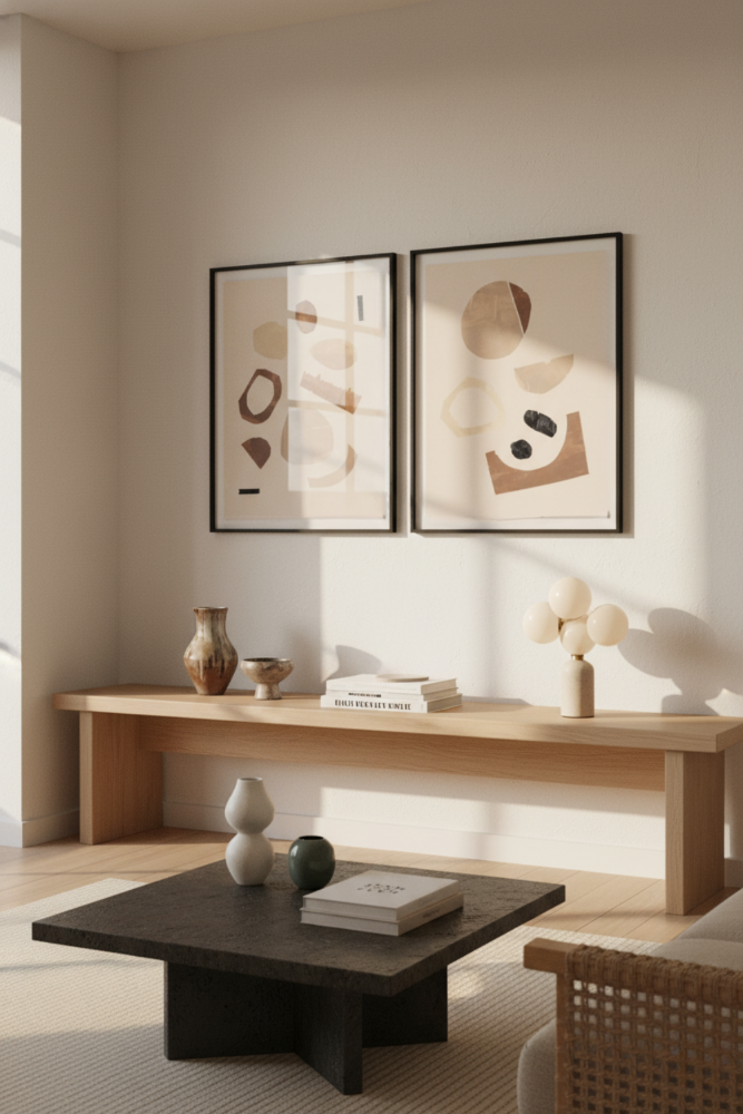Este set de ilustraciones abstractas presenta formas orgánicas y geométricas dispuestas en una paleta de tonos terrosos suaves y neutros. Los elementos se distribuyen de manera equilibrada sobre un fondo claro, evocando una sensación de serenidad y minimalismo. Las texturas y los colores cálidos se combinan para crear una composición armoniosa y moderna, ideal para espacios que buscan un toque de calma y sofisticación.