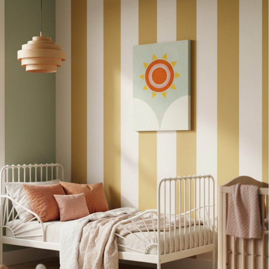 Esta ilustración minimalista evoca calidez y serenidad a través de un diseño limpio y simbólico. Un sol estilizado en tonos naranjas y rosados, con triángulos amarillos como rayos, se alza sobre un fondo suave de color azul cielo. Las formas curvas en la parte inferior sugieren colinas o un horizonte, añadiendo un elemento de equilibrio y calma a la composición. Perfecta para interiores modernos o espacios que buscan transmitir optimismo y tranquilidad, esta obra decorativa aporta un toque de luminosidad y simplicidad con un diseño contemporáneo.