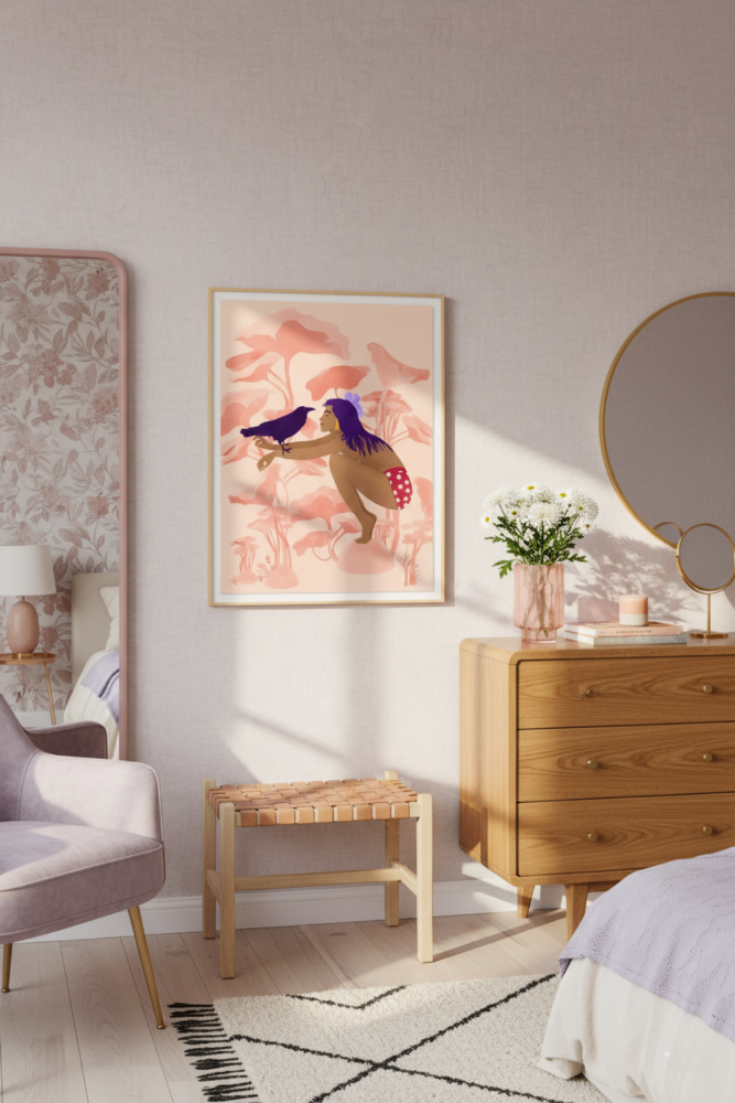 Esta obra encantadora muestra a una mujer en cuclillas, conectando con un cuervo sobre su brazo, rodeada de una selva rosada de formas oníricas. El contraste entre los tonos morados, rojos y rosas crea una atmósfera tropical, mística y femenina. Perfecta para espacios que buscan transmitir introspección, libertad y conexión con la naturaleza desde una mirada poética y poderosa.