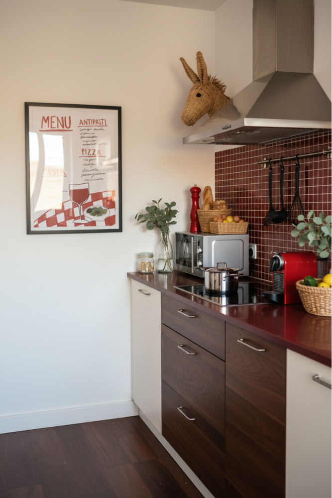 Esta ilustración presenta un diseño estilizado de un menú italiano, perfecto para decorar cocinas, comedores o restaurantes. Con un estilo de escritura manuscrita y un esquema de colores en tonos rojos, blancos y verdes, el diseño incluye secciones clásicas como vinos, pastas, pizzas y antipasti. En la parte inferior, se destaca una copa de vino junto a un pequeño plato de aceitunas, sobre un mantel de cuadros rojos y blancos que evoca la tradición italiana. Este cuadro combina calidez y simplicidad, añadiendo un toque rústico y acogedor a cualquier espacio donde se aprecie la comida y el diseño.