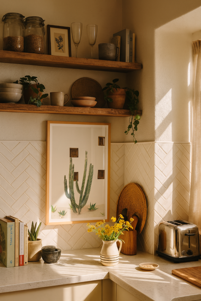 Este cuadro encapsula la esencia del diseño minimalista con inspiración en el desierto. Un cactus imponente se erige frente a una pared de tonos neutros, resaltado por pequeñas ventanas de madera que añaden un aire rústico y cálido. La composición equilibra naturaleza y arquitectura con una estética serena y moderna, perfecta para quienes buscan una decoración con toques orgánicos y sofisticados.