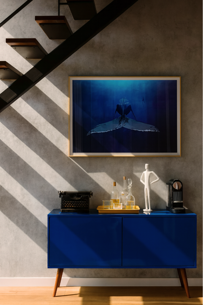 Este cuadro decorativo presenta una ilustración minimalista y cautivadora de una ballena sumergiéndose en las profundidades del océano junto a la silueta de un buzo, en una atmósfera serena y misteriosa en tonos azul profundo y turquesa. 🐋🌊 Perfecta para decorar espacios contemporáneos que buscan inspiración, tranquilidad y conexión profunda con la naturaleza, ideal para salas, dormitorios o estudios que quieran un toque relajante y elegante.