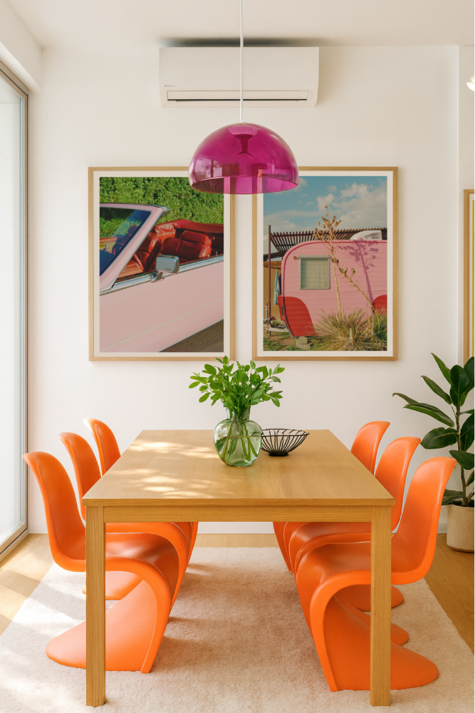 Una caravana clásica pintada en vibrantes tonos rosa y rojo se convierte en la protagonista de esta fotografía retro. El cielo azul despejado y las plantas desérticas refuerzan la atmósfera cálida y nostálgica, evocando viajes por carretera y tardes soleadas en el suroeste americano. Ideal para quienes buscan darle un aire auténtico y vintage a sus paredes.