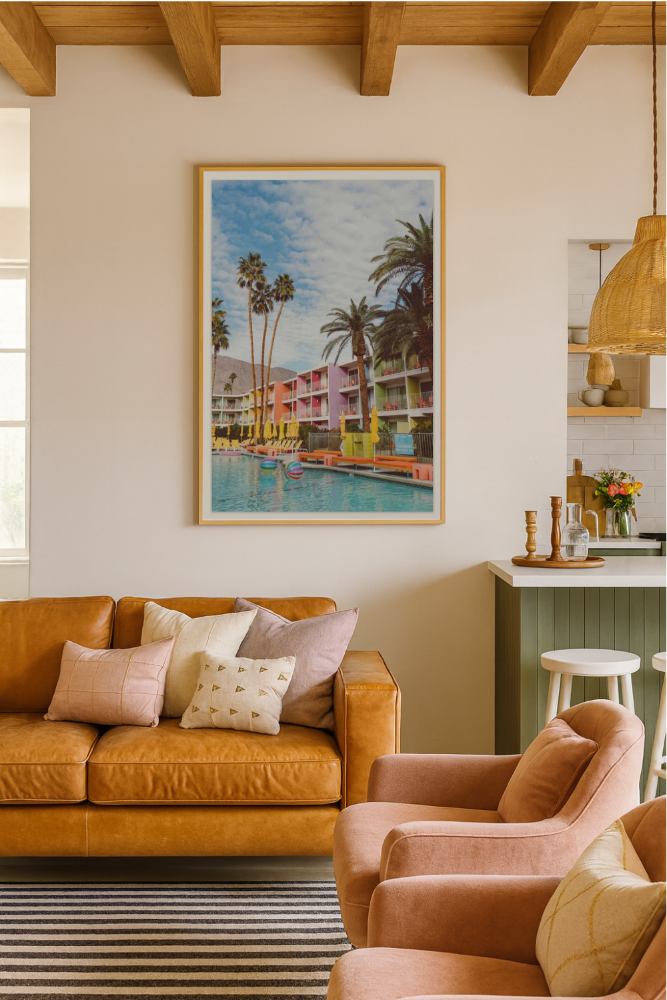 Este cuadro es un viaje directo a los veranos nostálgicos de los años 60 y 70, con una escena vibrante que captura la esencia de un hotel retro de colores pastel. Las fachadas en tonos rosa, verde y amarillo contrastan con las palmeras altísimas y el azul refrescante de la piscina, evocando una sensación de escape y relajación instantánea. La calidez del sol reflejada en las sombrillas y los camastros añade un toque acogedor, perfecto para quienes aman la estética vintage y los destinos llenos de encanto. Este cuadro es ideal para decorar espacios como la sala, el comedor o incluso un home office, dándole un aire fresco y alegre. Su energía vibrante y sus tonos luminosos lo convierten en una pieza que transmite felicidad y descanso, recordando esos días interminables de verano junto a la piscina.