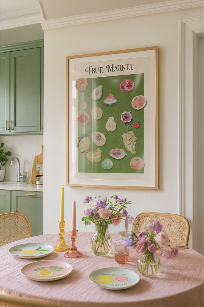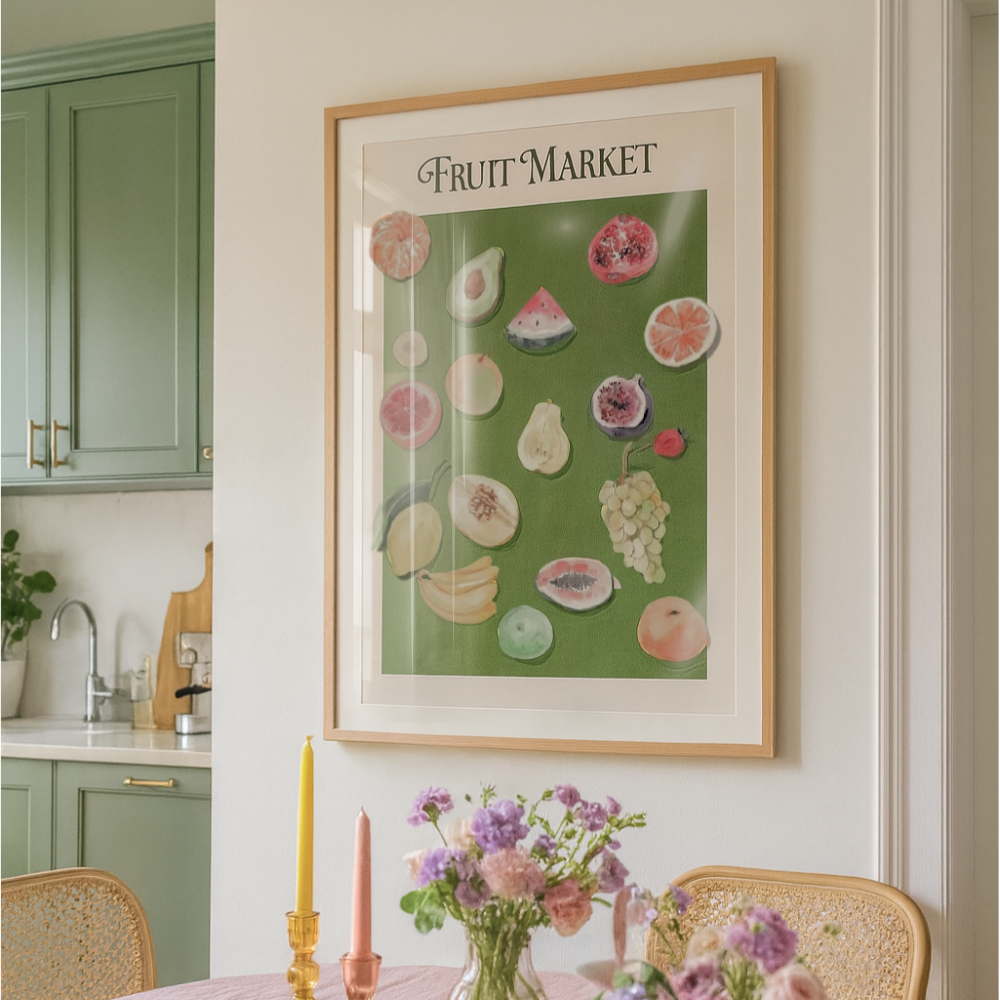 Este cuadro es una explosión de vitalidad con ilustraciones en acuarela de frutas frescas como papaya, aguacate, uvas, sandía, toronja y más. Perfecto para darle un toque alegre y natural a tu cocina o comedor. 🌿 Su fondo verde oliva y el estilo botánico lo hacen ideal para quienes aman la decoración cálida y orgánica con un guiño vintage encantador.