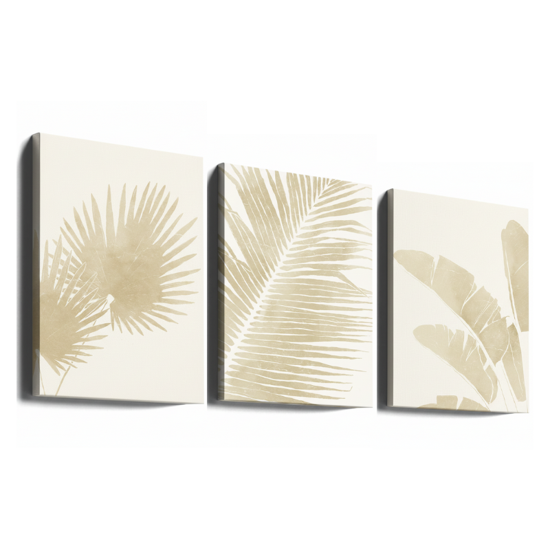 Este set de tres cuadros presenta hojas tropicales en tonos beige sobre fondo claro: una palmera abanico, una hoja de palma alargada y un grupo de hojas de plátano. La composición logra un equilibrio perfecto entre frescura y sofisticación, ideal para sumar textura y armonía visual sin recargar. Queda hermoso en salas, dormitorios o espacios costeros, aportando un toque natural, sereno y contemporáneo 🌾✨