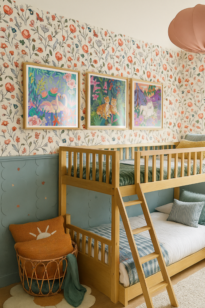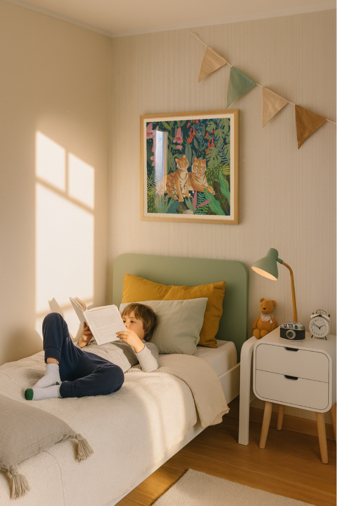 Este cuadro transmite fuerza y belleza natural con dos tigres descansando entre una selva exuberante llena de hojas verdes y flores en tonos rosa, rojo y violeta. La escena combina la majestuosidad de los felinos con la delicadeza del entorno, creando un equilibrio perfecto entre poder y serenidad. Su paleta intensa y su estilo artístico lo hacen ideal para espacios con personalidad, como una sala, comedor o estudio con aire bohemio y exótico. ✨🧡