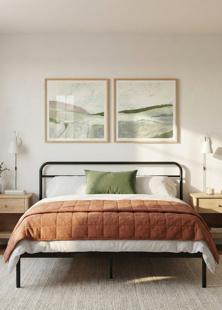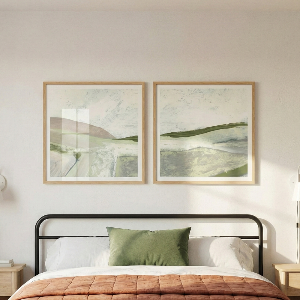 Una vista que transmite paz desde el primer trazo. Esta pintura sugiere un paisaje suave y abierto, donde las colinas se funden con el cielo a través de pinceladas amplias y fluidas. Los tonos predominantes —verde salvia, beige, marrón claro y blanco— crean una atmósfera calmada, ideal para espacios que buscan luz y serenidad. La composición, libre y sin contornos rígidos, combina lo pictórico con lo etéreo, como si estuviera en el límite entre la realidad y el recuerdo. Este cuadro queda perfecto en salas con decoración natural, comedores luminosos o recámaras con estilo relajado.