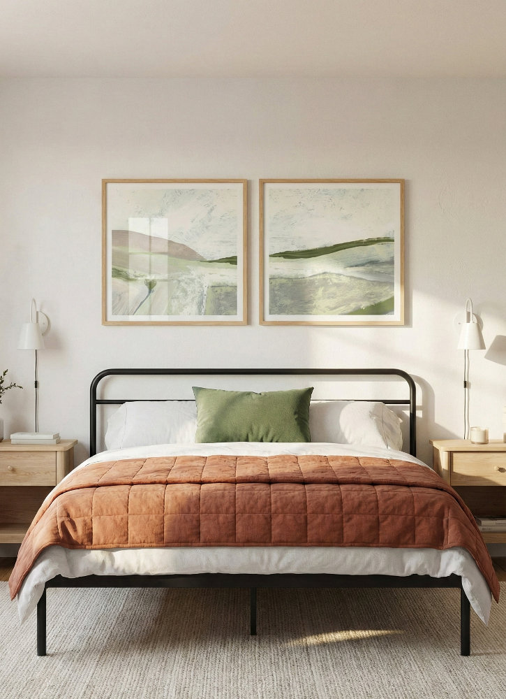 Este set evoca paisajes suaves, donde las colinas y campos se dibujan con pinceladas amplias en tonos beige, verde oliva, blanco y gris claro. La atmósfera es serena y abierta, con cielos diluidos que iluminan las formas orgánicas que se funden en el horizonte. Cada cuadro sugiere una escena distinta, pero ambas piezas dialogan en armonía, como si capturaran dos momentos del mismo recorrido. Ideal para dormitorios relajados, salas luminosas o comedores con decoración natural y contemporánea.