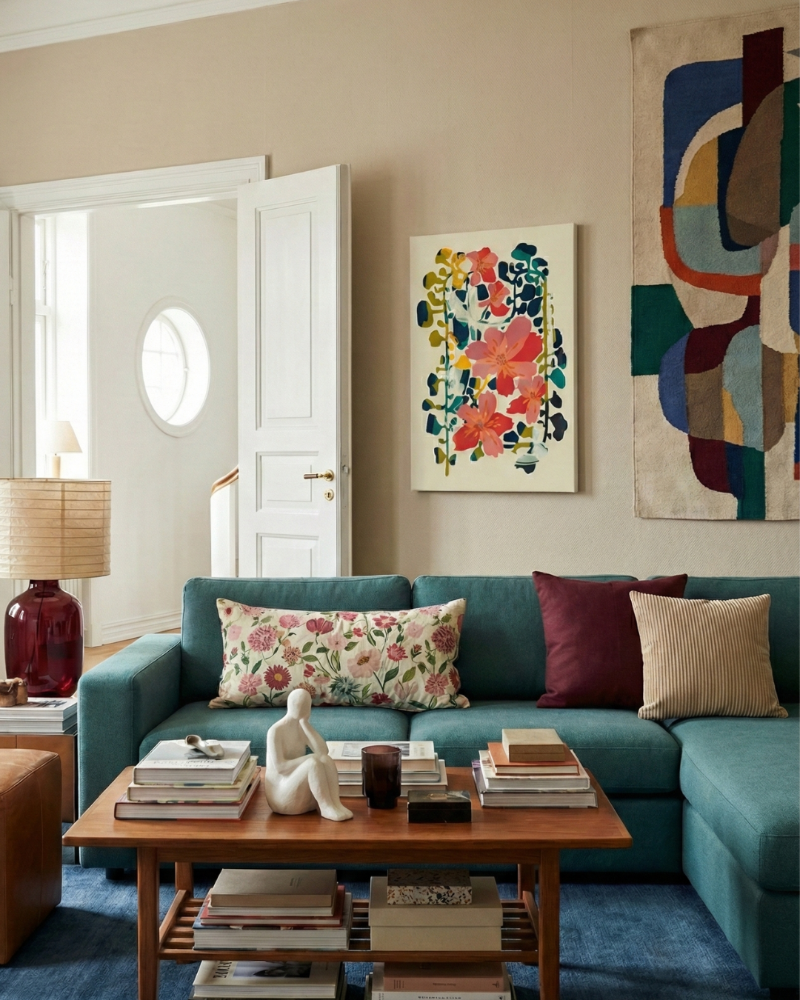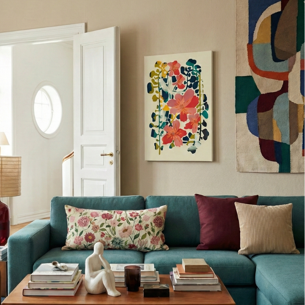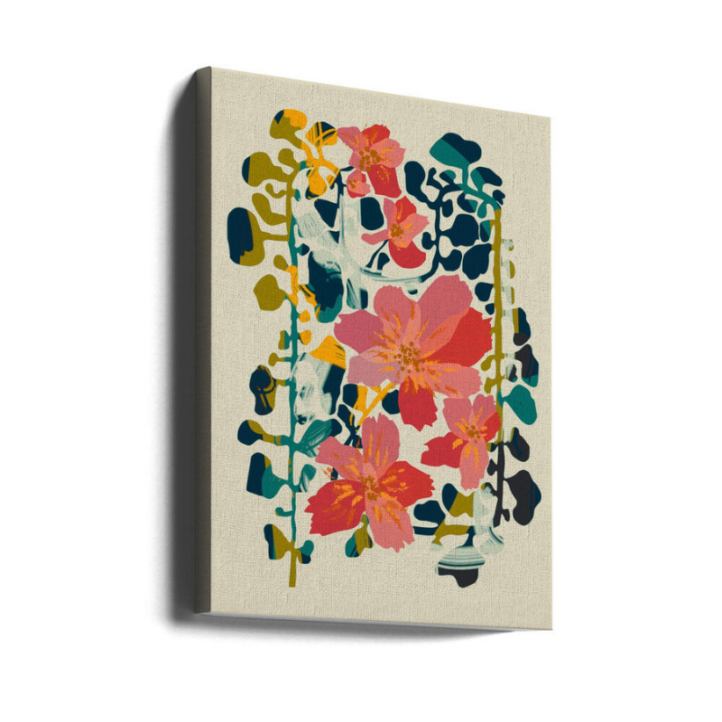 Este cuadro combina flores de gran tamaño con formas botánicas abstractas, creando una composición vibrante y muy equilibrada. Las flores en tonos coral y rosa destacan sobre un fondo claro, mientras que las hojas y siluetas orgánicas en verdes profundos, azul petróleo y toques mostaza aportan contraste y movimiento. El estilo gráfico y contemporáneo le da un aire fresco y artístico, ideal para quienes buscan una pieza floral distinta, con personalidad y presencia visual. Funciona perfecto para darle vida a una sala, un comedor o un home office, sumando color sin perder elegancia. 🌿🎨