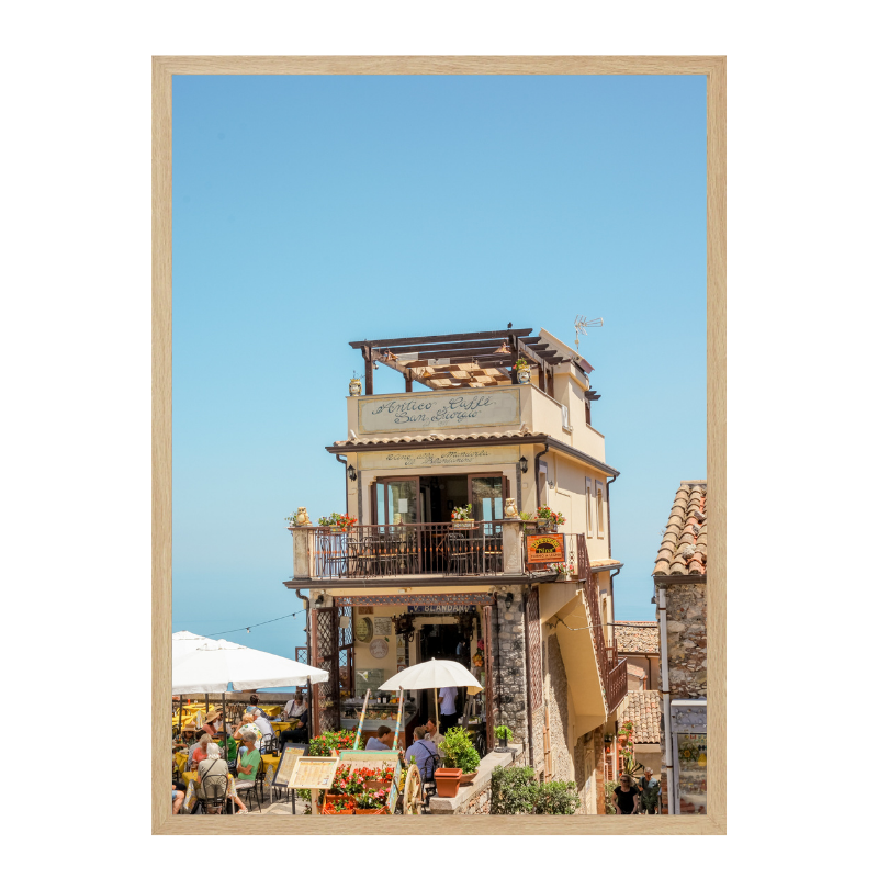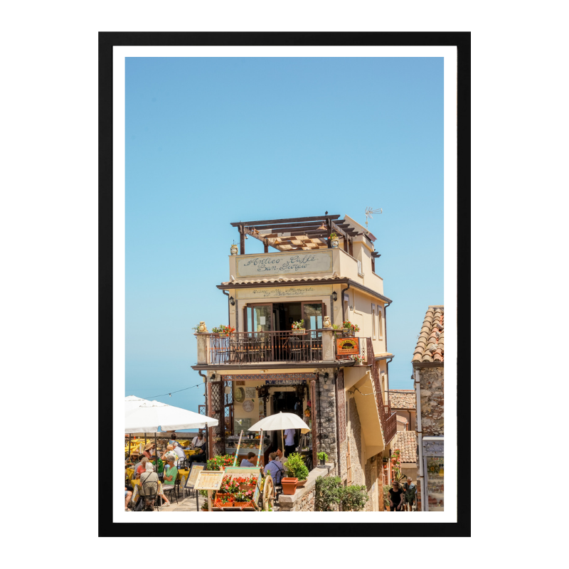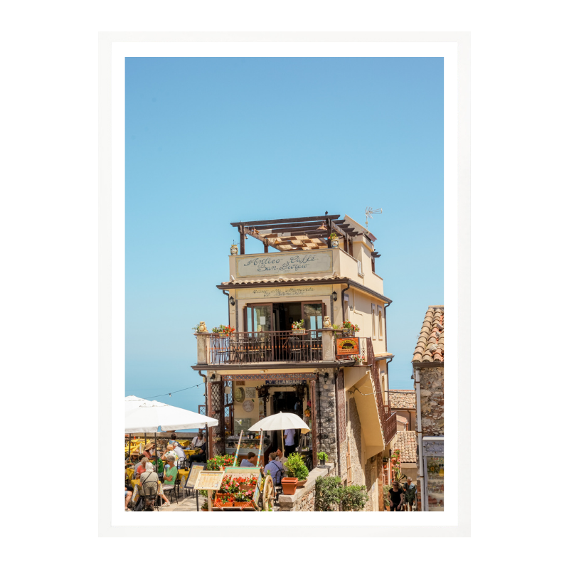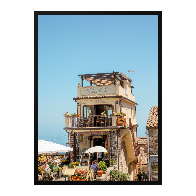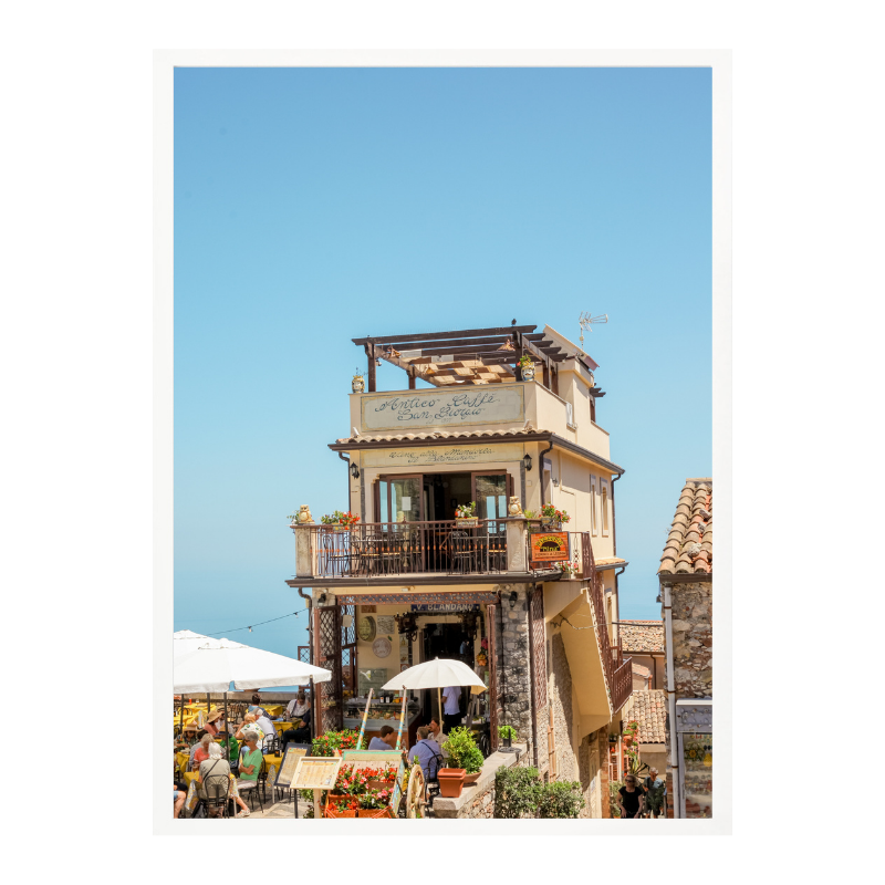 Esta fotografía captura una escena vibrante de Castelmola, Sicilia, uno de esos pueblos donde el tiempo parece ir más despacio. La imagen muestra una construcción tradicional elevada sobre una calle animada, con terrazas llenas de gente, flores y sombrillas blancas que contrastan con el cielo azul intenso del Mediterráneo. La arquitectura de piedra, los balcones y la vida social al aire libre reflejan el carácter cálido y auténtico del sur de Italia. Es una imagen que transmite viaje, encuentro y disfrute, ideal para quienes buscan un paisaje urbano mediterráneo con energía, historia y mucha luz ☀️🇮🇹