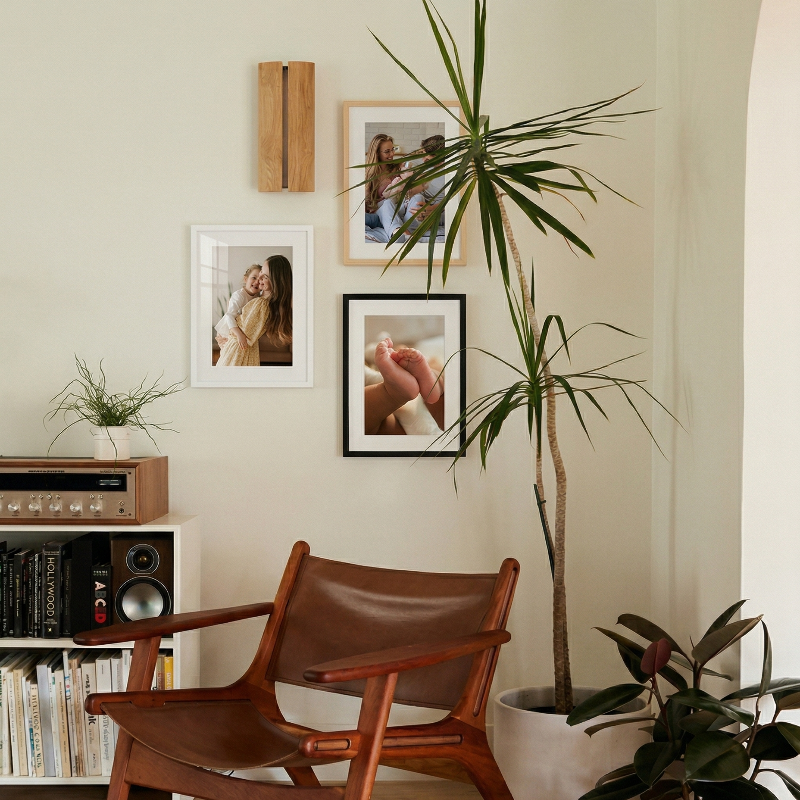 Sube tu archivo, personaliza la medida y elige el color del marco: madera, negro o blanco.