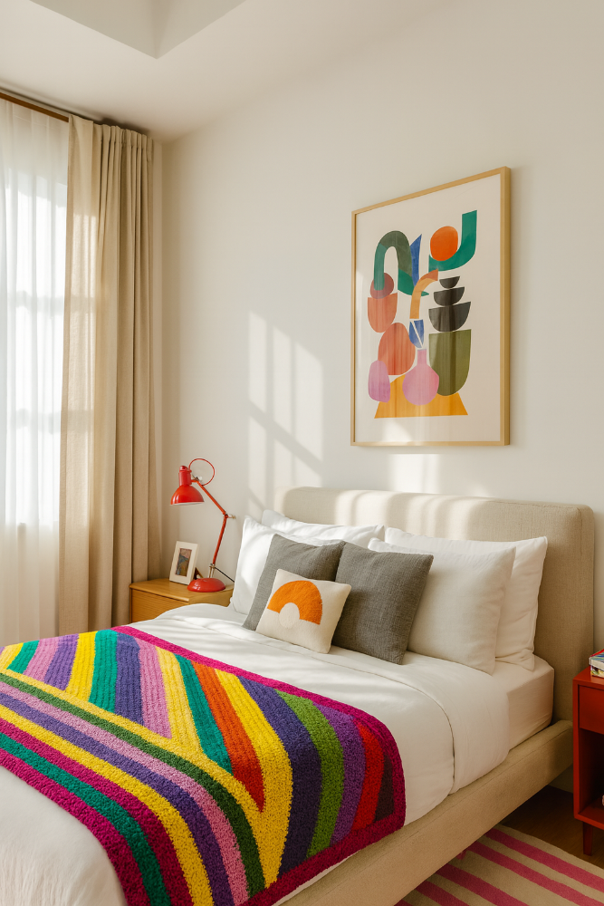 Esta composición abstracta emplea una variedad de formas geométricas, principalmente arcos, círculos y figuras que sugieren vasijas o recipientes, organizados de manera armónica. La paleta de colores es rica y diversa, con tonos de verde, naranja, rosa, azul y amarillo, lo que aporta un equilibrio visual entre colores cálidos y fríos. Los elementos están dispuestos en diferentes planos, creando un sentido de profundidad y capas. Esta obra podría servir como una pieza central en un ambiente contemporáneo, añadiendo un toque de vitalidad y modernidad a cualquier espacio.