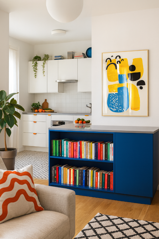 Esta obra presenta una composición abstracta vibrante con colores brillantes y contrastantes de amarillo, azul y negro sobre un fondo claro. Las formas geométricas predominan, incluyendo bloques de color que se superponen, con detalles de puntos y líneas en blanco que añaden textura y dinamismo. Los elementos negros en la parte superior parecen representar expresiones o símbolos abstractos, aportando un toque de intriga. Esta pieza combina formas sólidas con detalles juguetones, ideal para espacios modernos que buscan una pieza de arte abstracto enérgica y contemporánea.