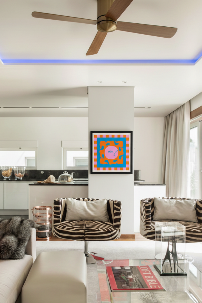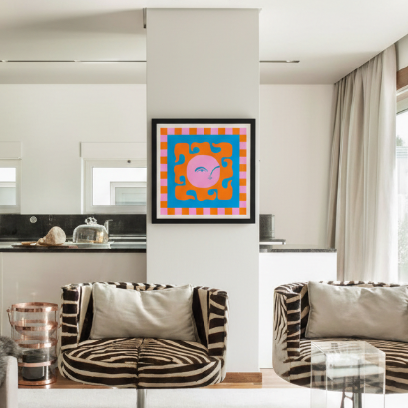 Este cuadro lleno de color y nostalgia captura la energía del sol con un estilo retro que mezcla arte pop y diseño gráfico de los años 70. 💙 Con un rostro rosado rodeado de formas naranjas sobre fondo azul intenso, crea una composición alegre y audaz que ilumina cualquier espacio. Perfecto para decorar salas, estudios creativos o rincones donde se busca un toque divertido y moderno. 🌞
