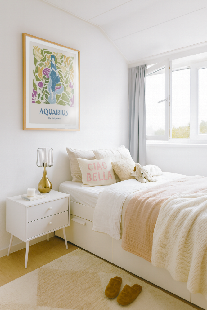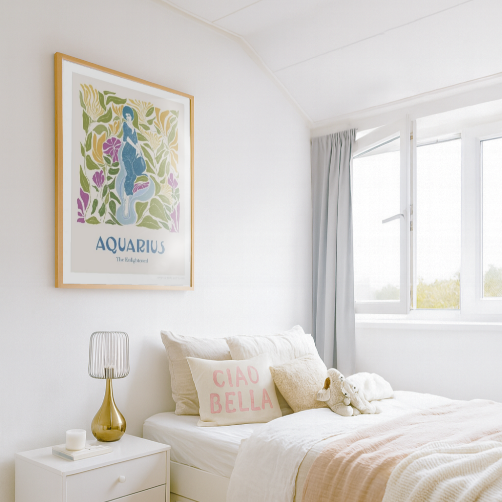 Con un aire enigmático y creativo, esta ilustración celebra la energía única de Acuario 🌬️💧. Rodeada de flores vibrantes en tonos morado, amarillo y verde, la figura femenina sostiene un cántaro que derrama agua, fluyendo en forma de espiral celeste. La composición transmite renovación, pensamiento libre y conexión espiritual. Perfecta para espacios donde fluye la imaginación: un rincón de lectura, un estudio o cualquier ambiente que invite a romper moldes y soñar en grande 🌸