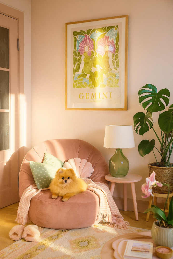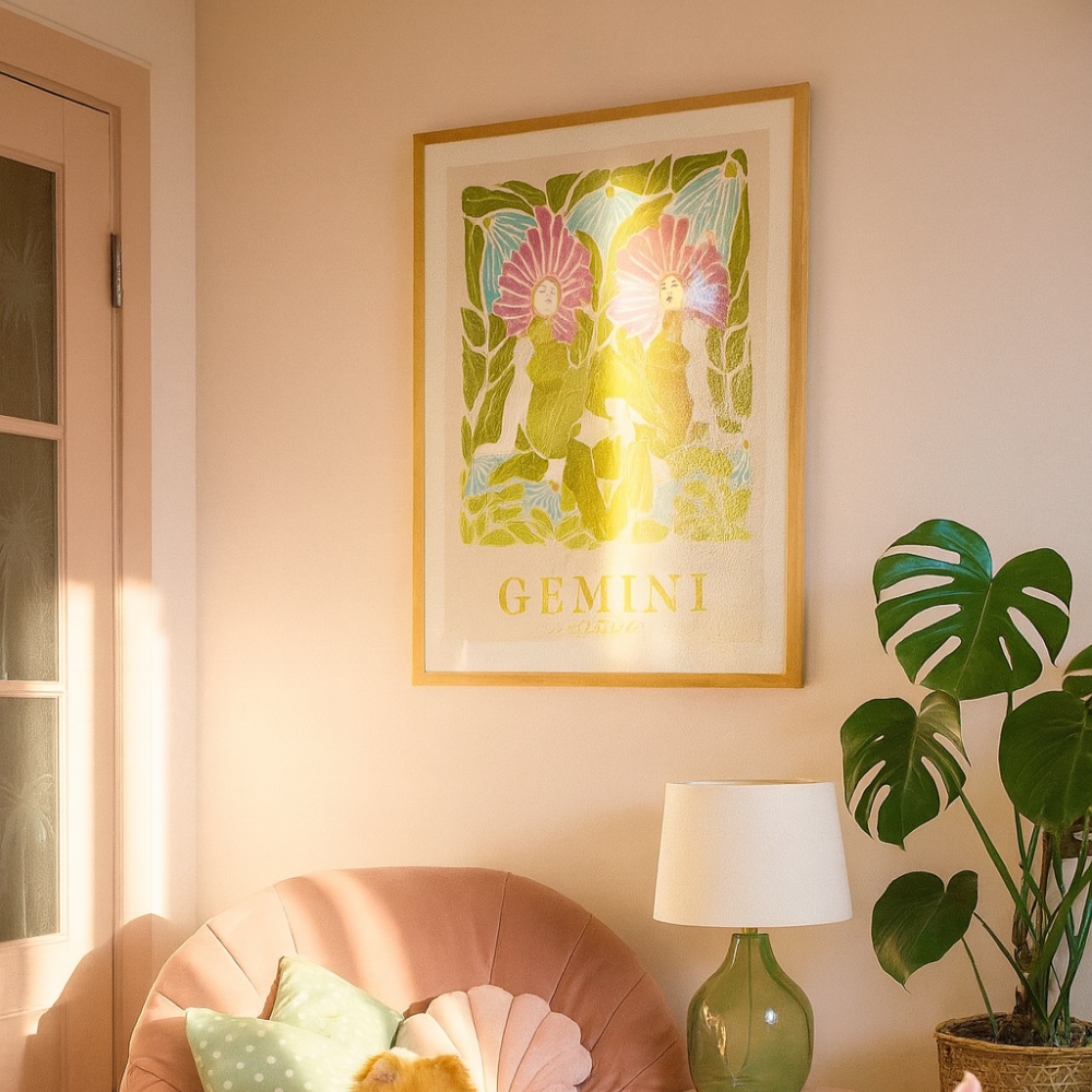 Este cuadro representa la esencia vibrante y cambiante de Géminis a través de una ilustración simétrica con dos figuras femeninas que evocan la dualidad del signo. Sus cabezas florecen como margaritas rosas y están rodeadas de hojas verdes y pétalos azules, en una composición que grita frescura, dinamismo y estilo retro. Es una obra perfecta para espacios creativos como un estudio, home office o dormitorio juvenil, ya que combina una paleta colorida con un diseño que celebra la versatilidad y el juego interior de los geminianos. 🌸♊