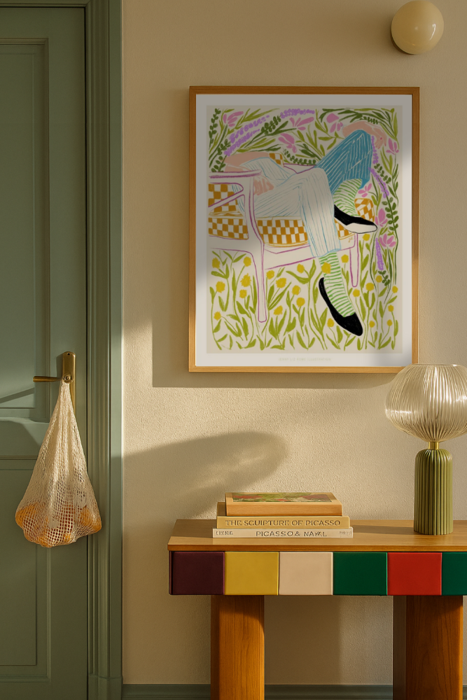 🌼 Una escena que grita descanso y estilo con toda la onda. Esta ilustración nos muestra unas piernas cruzadas sobre una silla de diseño, en medio de un jardín rebosante de flores silvestres 🌿💐. Las rayas en los pantalones y calcetas verdes aportan un aire divertido y moderno, mientras el fondo botánico llena de vida cualquier rincón. Perfecto para espacios con espíritu libre y amor por los detalles únicos.