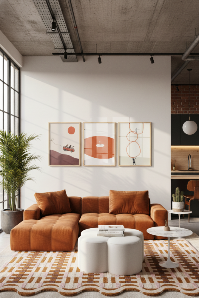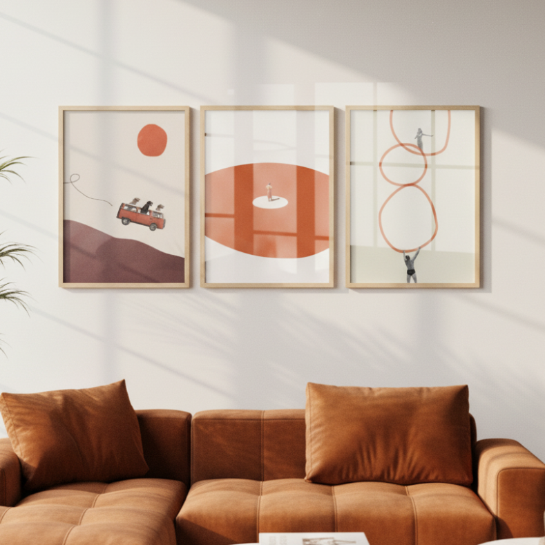 Este set de cuadros mezcla lo surreal y lo lúdico en tres escenas llenas de imaginación: un viaje en combi por colinas coloridas, una figura diminuta en un gran espacio circular y un par de personajes jugando con líneas que se transforman en lazos gigantes. 🎈 Su estilo contemporáneo con toques de collage y paleta en tonos terracota, beige y rojo los convierte en piezas ideales para espacios creativos, pasillos modernos, salas con personalidad o estudios llenos de inspiración. 🌞