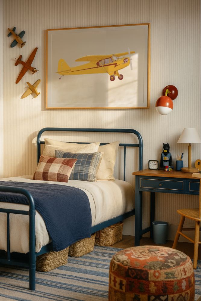 Esta ilustración presenta una avioneta clásica en un vibrante color amarillo, destacando su diseño aerodinámico y detalles vintage como la hélice y el elegante rayo decorativo en el fuselaje. El fondo beige minimalista potencia el protagonismo del avión, evocando la emoción de los primeros días de la aviación y la libertad del vuelo. Este cuadro es ideal para entusiastas de la aviación, el diseño retro o para quienes buscan un toque de aventura y estilo nostálgico en su decoración.