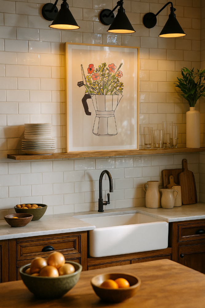 Esta encantadora ilustración combina lo cotidiano con lo natural al mostrar una cafetera estilo moka que florece como un jarrón lleno de vibrantes flores rojas y amarillas. Con un estilo artístico minimalista y líneas limpias, los colores vivos de las flores contrastan con los tonos neutros de la cafetera, creando una composición alegre y original. Perfecta para amantes del café, la naturaleza y el diseño creativo, este cuadro añade un toque fresco y acogedor a cualquier espacio, ideal para cocinas, cafeterías o rincones decorativos llenos de vida.