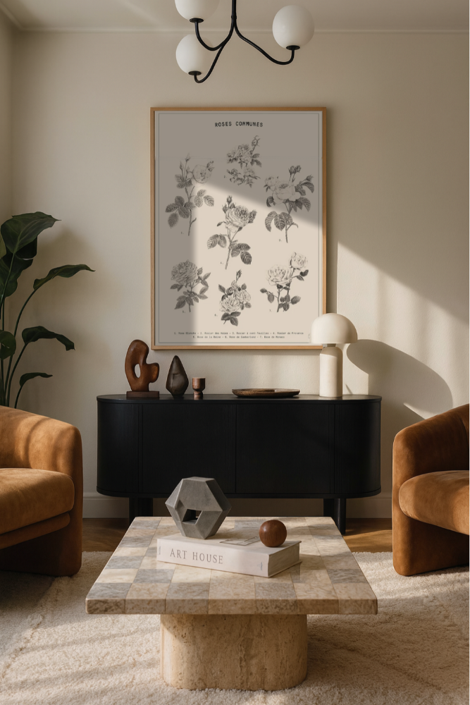 Esta ilustración botánica, titulada "Roses Communes", es una obra de estilo clásico que muestra siete variedades de rosas comunes dibujadas con delicados trazos en blanco y negro. Cada flor está numerada y acompañada por su nombre en un pie de página, brindando un enfoque educativo y estético. Su diseño elegante y detallado, enmarcado sobre un fondo claro, la convierte en una pieza ideal para amantes de la botánica, la decoración vintage o quienes buscan añadir un toque de sofisticación natural a sus espacios. Perfecta para dar un aire romántico y atemporal.