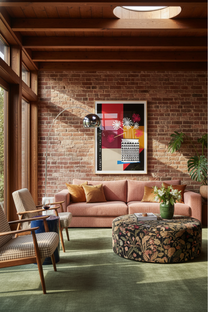 Este cuadro es una explosión de estilo gráfico con aire retro. Las flores, hechas con formas geométricas, emergen de un jarrón en blanco y negro con patrones triangulares, sobre un fondo de bloques de color en rojo, granate, mostaza, negro y beige. Es una pieza fuerte y sofisticada que le va perfecto a salas modernas, pasillos con carácter o espacios creativos que buscan algo más atrevido.