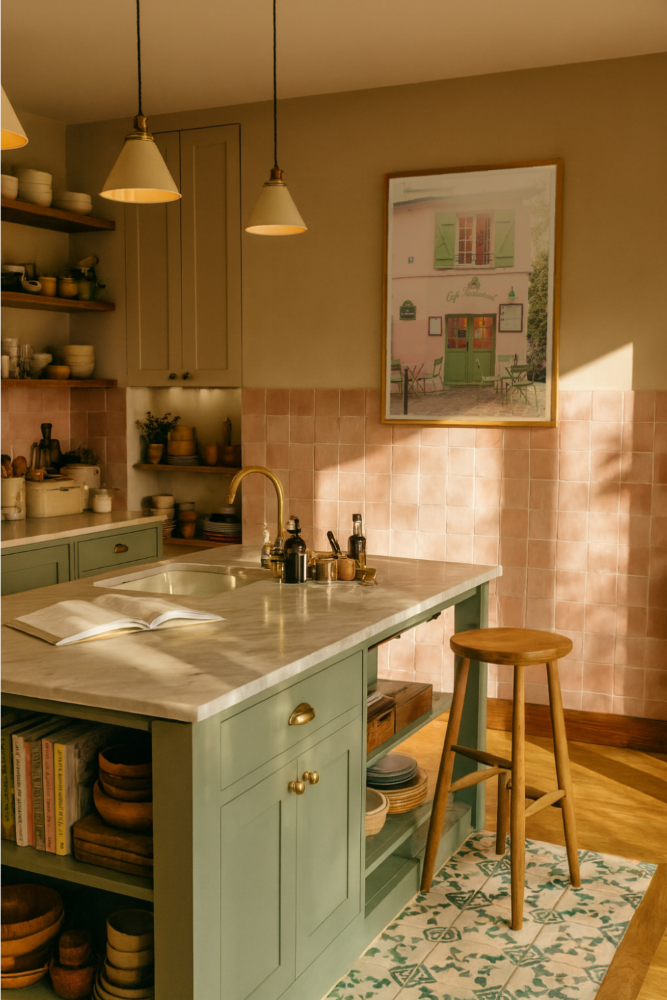 Esta fotografía muestra la encantadora fachada de un café con estilo francés. Las ventanas con contraventanas verdes, las sillas de metal al aire libre y la luz cálida del ambiente evocan una atmósfera acogedora. Es ideal para decorar espacios que busquen transmitir un aire romántico y bohemio, típico de las calles parisinas o rincones europeos pintorescos.