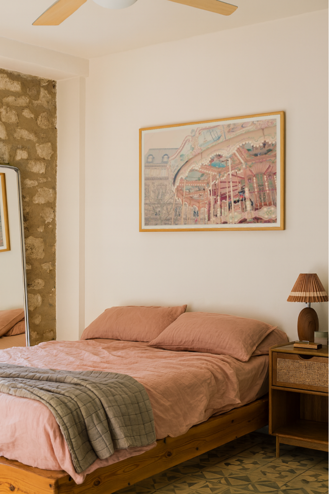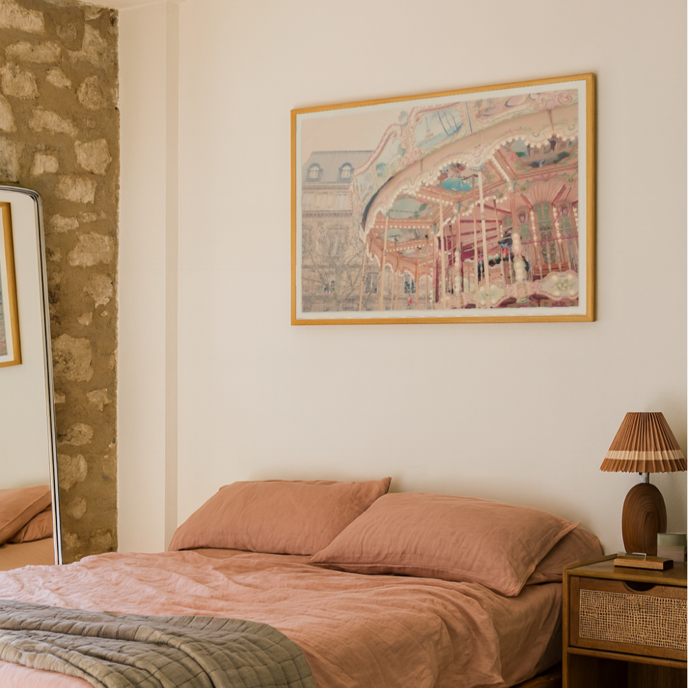 Esta fotografía evoca una atmósfera romántica y nostálgica con la imagen de un carrusel antiguo en plena ciudad europea, rodeado de arquitectura clásica y árboles invernales. Los detalles ornamentales, las luces cálidas y los tonos pastel del tiovivo contrastan suavemente con el fondo neutro del edificio de piedra, generando una composición armoniosa y encantadora. Es una pieza ideal para quienes aman los viajes, lo vintage y los momentos que parecen suspendidos en el tiempo. Queda perfecta en salas luminosas, estudios creativos, rincones de lectura o recámaras con estilo delicado y soñador. 💫