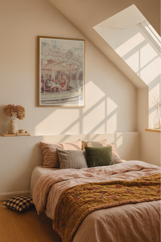 Esta fotografía transmite la melancolía dulce de un día frío con cielo claro y árboles sin hojas, enmarcando la escena de un carrusel vacío lleno de caballos de colores pastel. El ambiente es sereno, casi silencioso, y la paleta de tonos suaves —rosas, cremas, aqua y dorados apagados— refuerza ese encanto delicado y atemporal. La composición captura un momento detenido en el tiempo, lleno de memoria, infancia y ensueño. Es ideal para salas con luz natural, recámaras románticas o estudios donde se busque un toque nostálgico, vintage y poético. 🌬️