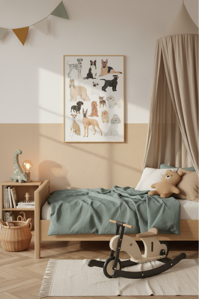 ¿Hay algo más cool que un perrito con lentes? Esta ilustración reúne a diferentes razas de perros, cada uno con su personalidad única y sus gafas distintivas. Desde un gran danés elegante hasta un pug travieso, todos están ilustrados con un estilo suave, simpático y muy moderno. Los colores cálidos y la estética dibujada a mano hacen que este cuadro sea perfecto para decorar espacios infantiles, salas de espera veterinarias, estudios creativos o cualquier rincón donde quieras sumar una dosis de ternura y buen humor. Ideal para amantes de los perros, el arte con animales y la decoración con toques juguetones y contemporáneos. 🧡