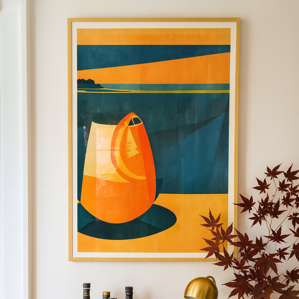 Este cuadro decorativo presenta una ilustración estilizada y contemporánea de un refrescante cóctel estilo Spritz en tonos vibrantes de naranja y azul profundo, acompañados de la atmósfera cálida de una puesta de sol sobre el océano. 🍹🌅 Su diseño retro aporta energía, frescura y estilo sofisticado, ideal para decorar espacios relajados, cocinas, comedores o áreas dedicadas a disfrutar la vida con buen gusto y alegría.