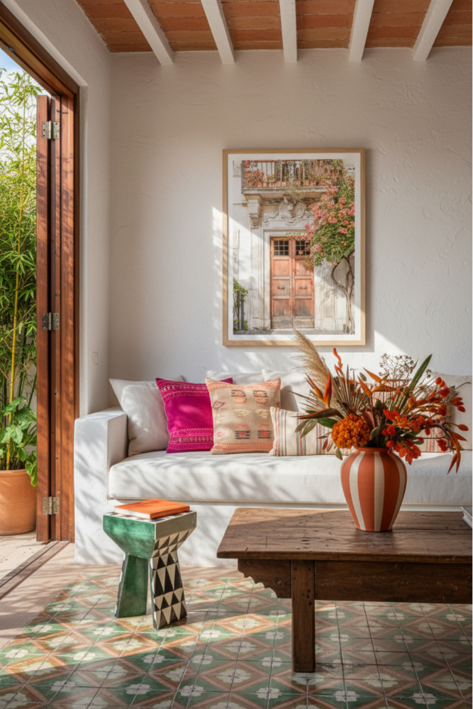 Esta fotografía parece salida de una película: una puerta de madera desgastada en tonos cálidos, balcones con macetas y una bugambilia que enmarca la escena con flores rosadas. La textura de la piedra, el hierro forjado y los detalles arquitectónicos antiguos le dan un aire nostálgico y encantador. Es ideal para darle calidez a espacios como el comedor, una sala luminosa o un pasillo acogedor. Perfecta para quienes buscan inspiración en las calles tranquilas del sur de Europa, donde la belleza está en lo cotidiano. 🍷🌺