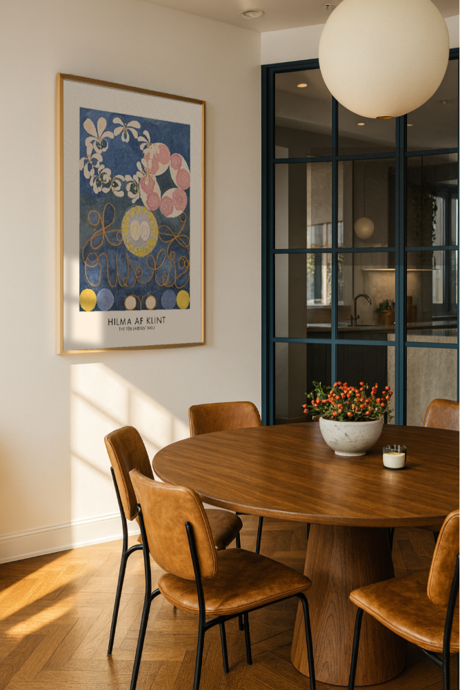 Esta obra, "The Ten Largest No. 1" de Hilma af Klint, es una pieza vibrante y simbólica que combina formas abstractas, florales y geométricas en una paleta rica y evocadora. Predominan los tonos azules profundos en el fondo, realzados por elementos en blanco, rosa y amarillo que representan energía y transformación. Líneas fluidas en tonos naranjas recorren la composición, creando una sensación de movimiento y conexión. Esta obra captura la esencia del ciclo de la vida y el crecimiento espiritual, siendo ideal para decorar espacios introspectivos, creativos o contemporáneos, aportando una atmósfera de misterio y profundidad emocional.