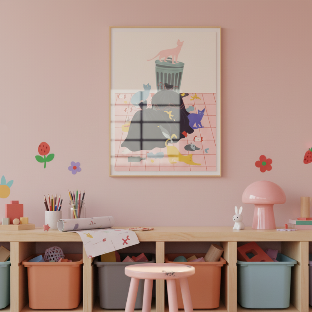 Esta divertida ilustración rebosa color y movimiento con un grupo de gatos curiosos explorando un pequeño desastre doméstico. Bolsas de basura, comida tirada y objetos esparcidos sobre un piso rosado se convierten en el escenario perfecto para esta escena juguetona. Los tonos saturados, el estilo plano y los personajes en colores pastel y vibrantes hacen de esta obra una pieza ideal para sumar un toque desenfadado y moderno a cocinas, estudios creativos o habitaciones infantiles. 🧃🐈