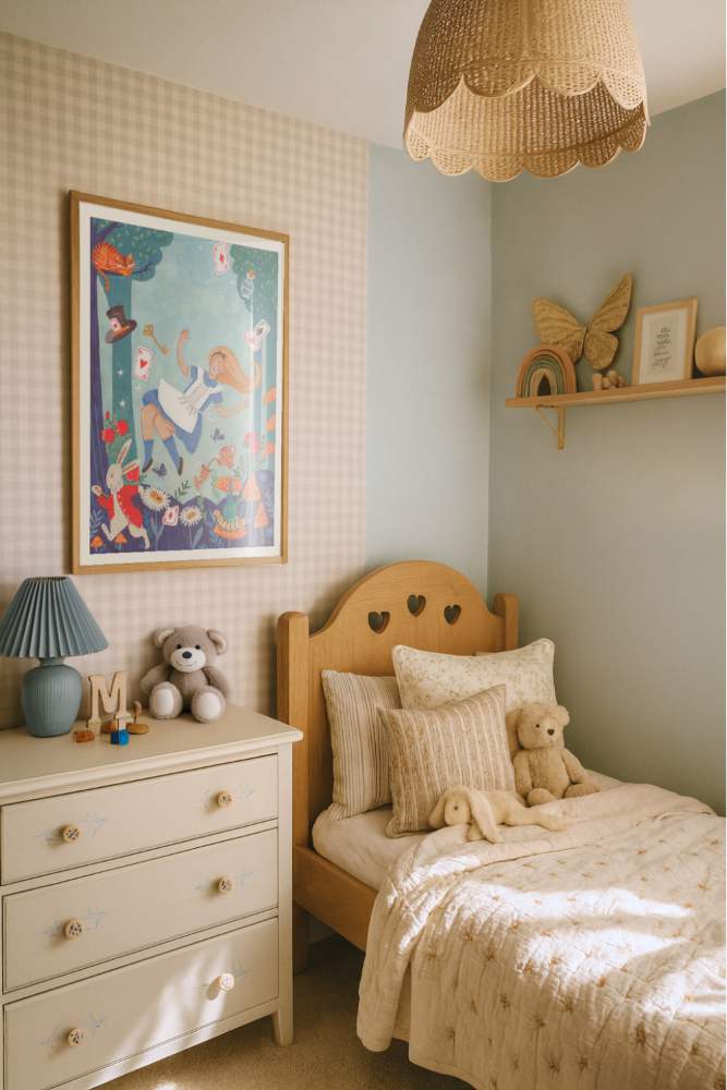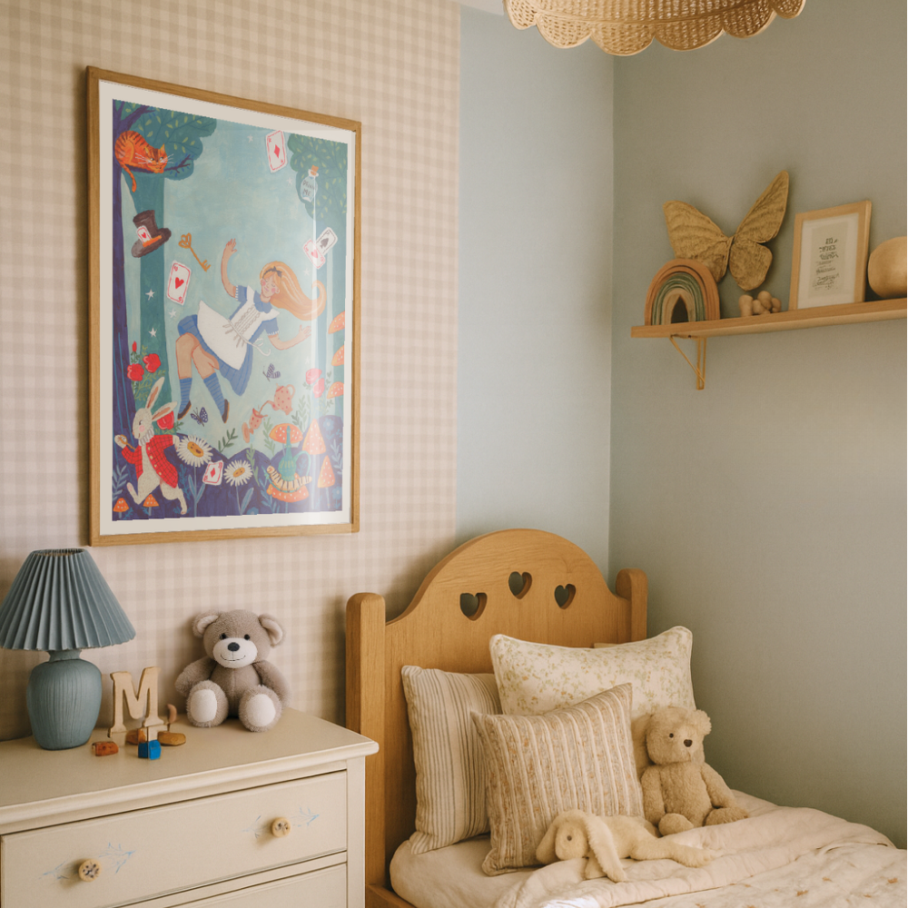 Este cuadro inspirado en el clásico literario nos transporta al mágico descenso de Alicia por la madriguera del conejo. Rodeada de cartas volando, llaves doradas, hongos anaranjados y el conejo blanco apresurado, la escena está llena de fantasía y color. Los tonos azules, verdes y naranjas vibran en armonía para crear un universo onírico que evoca imaginación y aventura, perfecto para decorar una habitación infantil, un estudio creativo o cualquier espacio que busque un aire lúdico y soñador. 🌼🃏