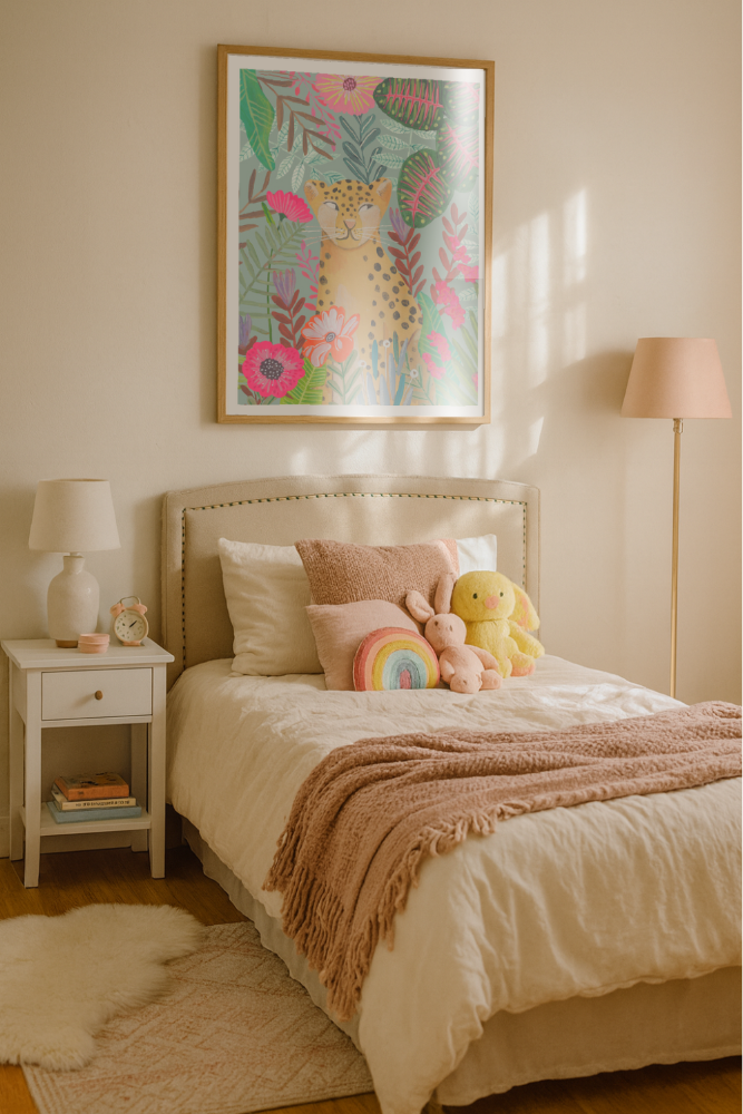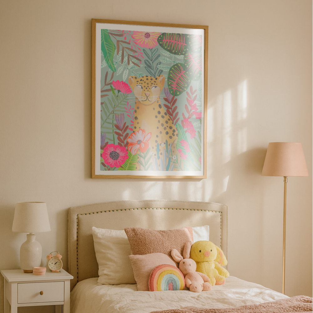 Este cuadro vibrante celebra la belleza de la naturaleza salvaje con un leopardo rodeado de hojas y flores en tonos intensos de rosa, verde y naranja. La mirada tranquila del felino contrasta con la energía colorida de la vegetación tropical, creando una pieza llena de fuerza y armonía. Ideal para dar un toque exótico y alegre a cualquier espacio, desde la sala hasta un rincón creativo. 🌸✨