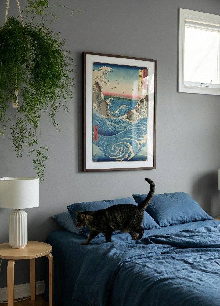 Este cuadro captura un mar intenso con olas en movimiento y un remolino protagonista, rodeado de acantilados y espuma blanca, bajo un cielo degradado en azul y rosa con aves volando en el horizonte. La estética tipo estampa japonesa (líneas finas, color plano y textura de grabado/xilografía) le da un look clásico y atemporal, perfecto para sumar energía y calma a la vez: ideal para amantes de paisajes marinos, arte oriental vintage y decoración minimalista con tonos azules. 🌊✨