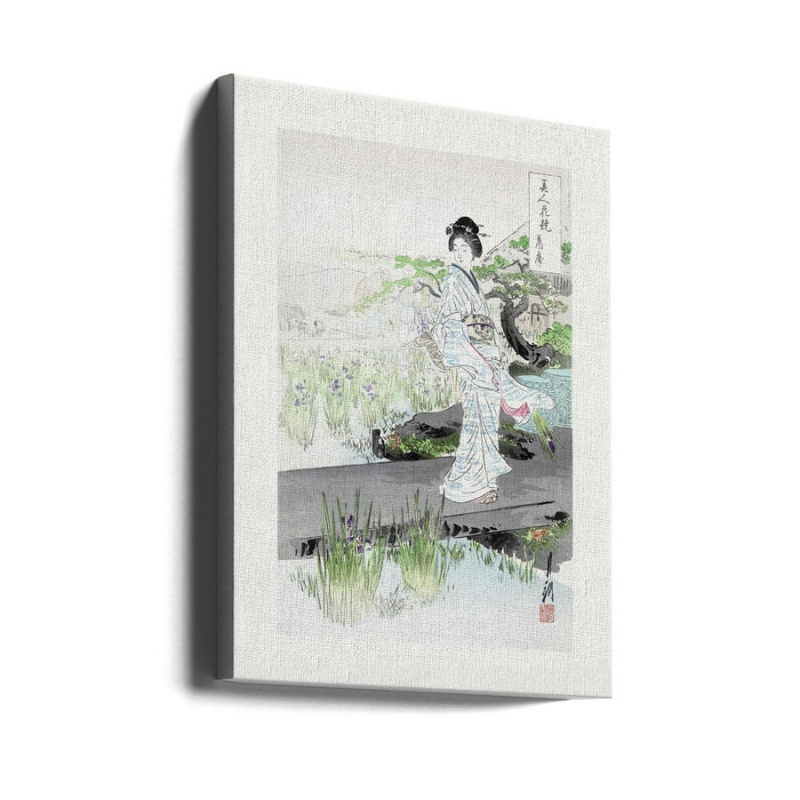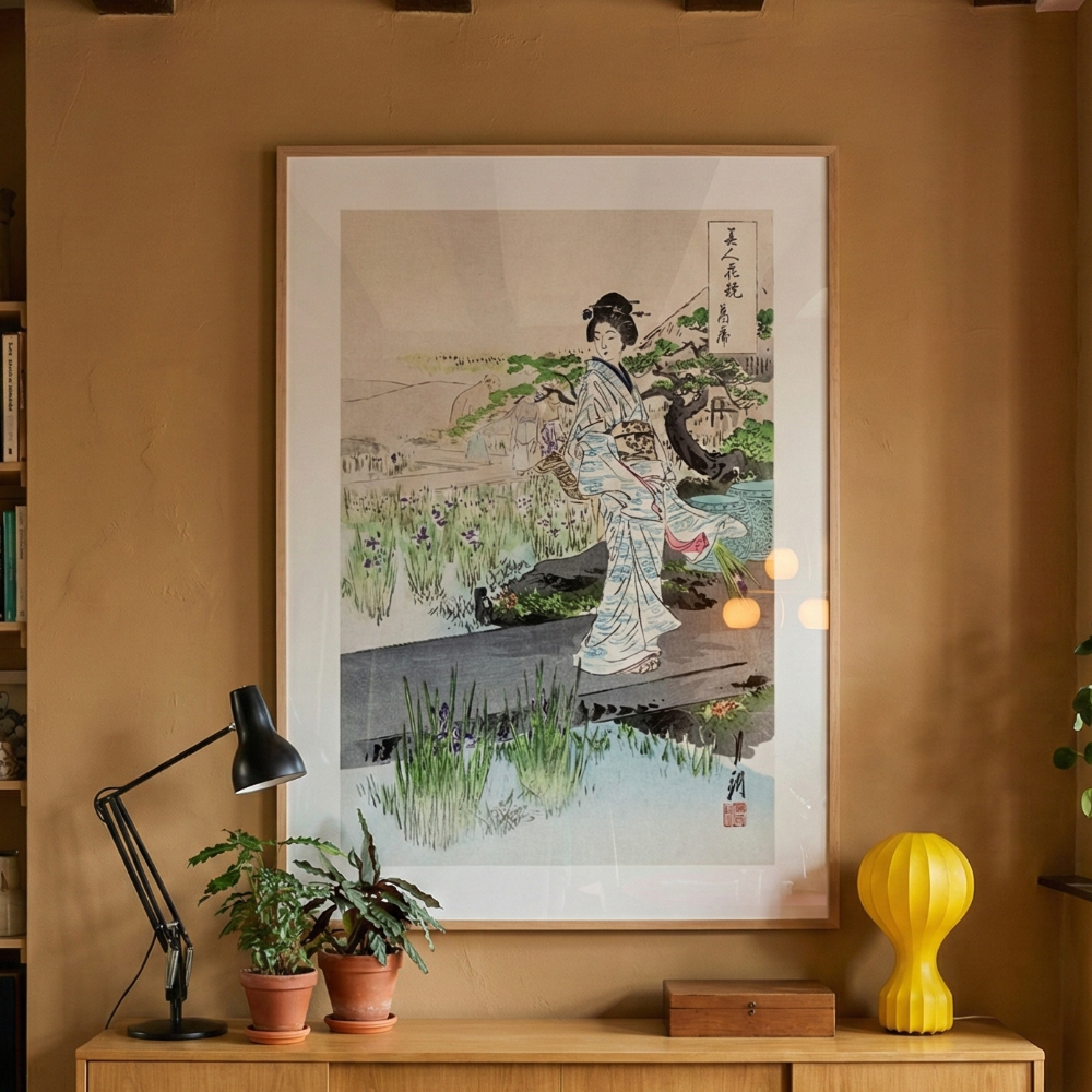 Este cuadro de estética japonesa ukiyo-e retrata a una mujer con kimono claro caminando en un jardín tranquilo, entre pastos verdes y flores lilas, con un árbol curvo y un fondo brumoso en tonos neutros que se siente súper ligero y elegante. La paleta suave (blancos, grises, verde salvia y toques lavanda) y las líneas delicadas tipo grabado crean una escena serena y romántica, ideal para quienes buscan cuadros de retratos femeninos, Japón clásico, naturaleza sutil y decoración minimalista con vibra zen. 🌿✨
