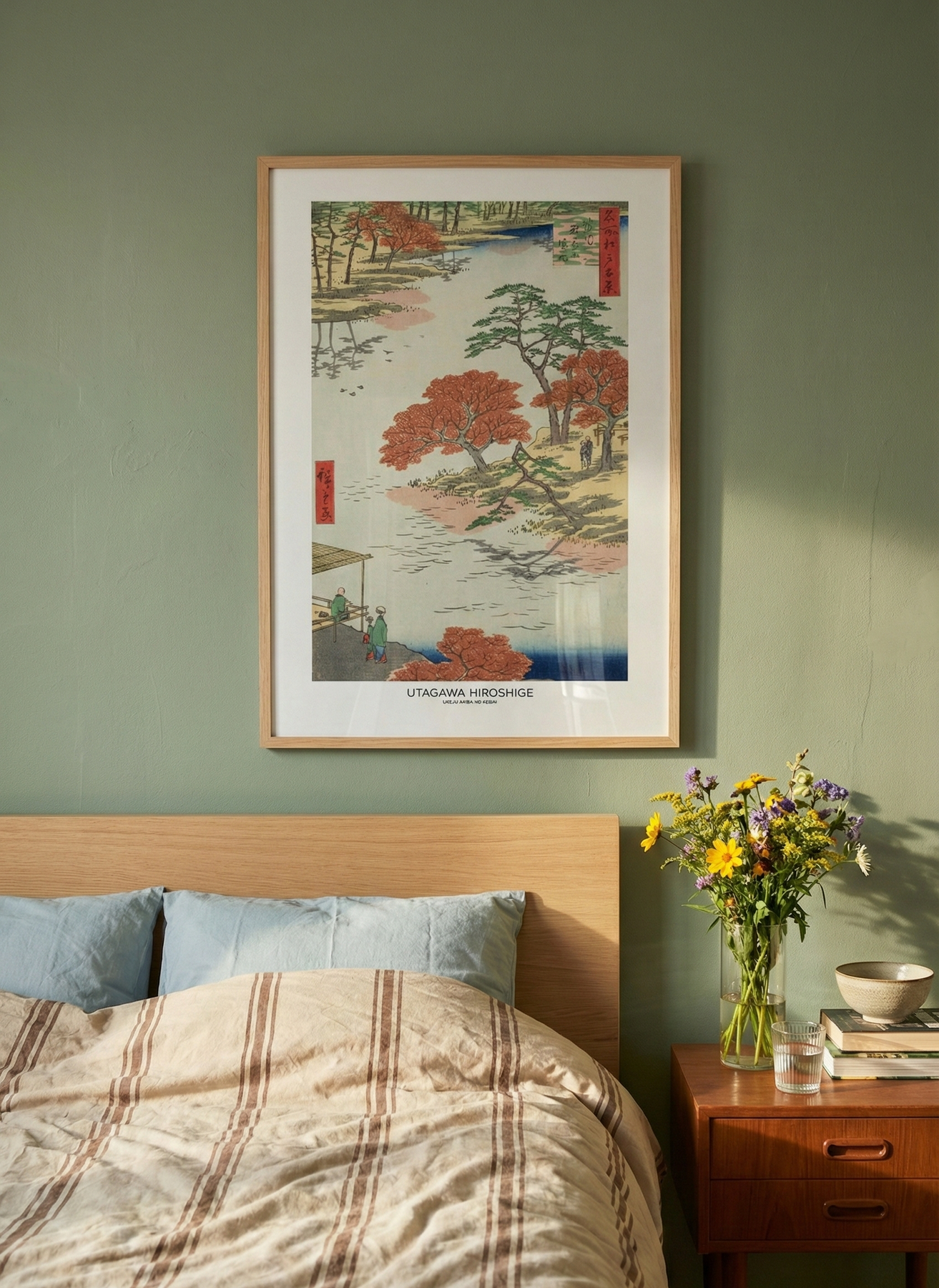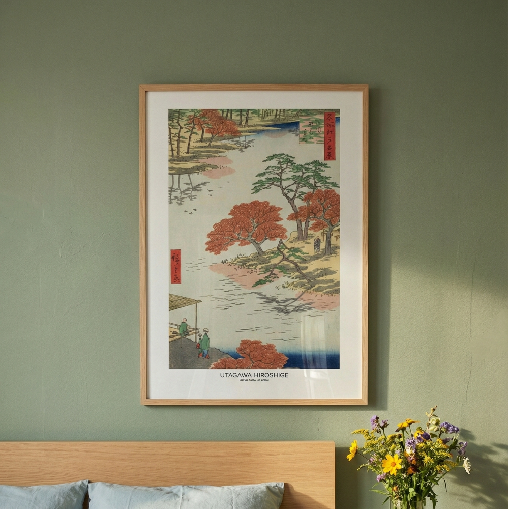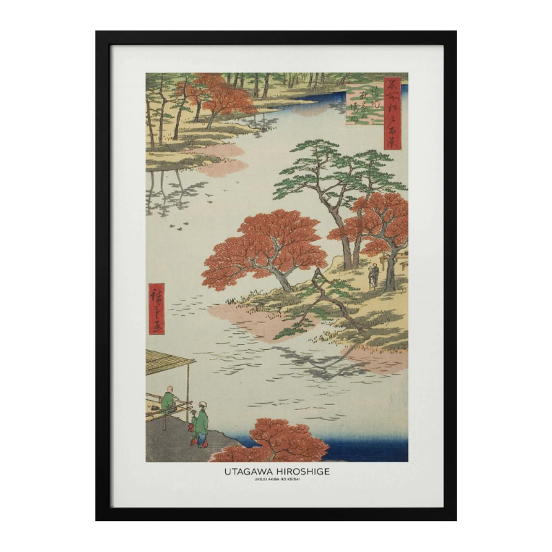 Este cuadro presenta una escena clásica del paisaje japonés tradicional, inspirada en la obra de Utagawa Hiroshige, maestro del grabado ukiyo-e. La composición muestra un río sereno rodeado de árboles de follaje rojo intenso y pinos verdes que equilibran la escena con delicadeza. Las figuras humanas pequeñas aportan escala y profundidad, mientras el agua refleja sutilmente el entorno natural. La paleta combina tonos beige, azul profundo, verde y rojo terracota, creando una atmósfera contemplativa y armoniosa. Ideal para sala, estudio, home office o dormitorio, esta pieza aporta sofisticación, historia y una estética oriental atemporal que conecta con el paisaje y la naturaleza.
