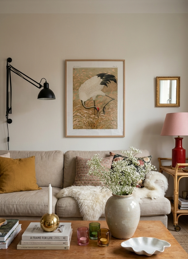 Este cuadro muestra una grulla de plumaje blanco con puntas negras y un toque rojo en la cabeza, posada entre pastos y flores silvestres en una escena de naturaleza súper delicada, con una paleta suave de beige, crema, dorado tenue y verdes apagados que se siente elegante y atemporal. La imagen tiene ese acabado de ilustración naturalista tipo grabado/litografía vintage, con textura de papel y detalles finos en las plumas, ideal para sumar calma visual con animales y paisajes en cualquier pared, especialmente si se busca arte clásico con vibra oriental y estética minimalista. 🕊️✨