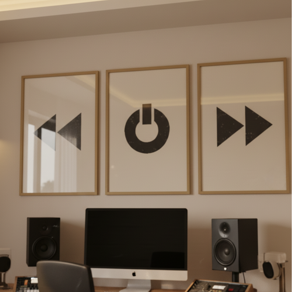 Este cuadro con el símbolo clásico de “adelantar” evoca esa nostalgia digital con un diseño limpio y contemporáneo. Con su fondo beige y figuras en negro con textura desgastada, es ideal para decorar espacios creativos o dar un toque dinámico y cool a tu estudio, oficina o galería personal. ¡Perfecto para quienes siempre miran hacia adelante! 🎶🖤