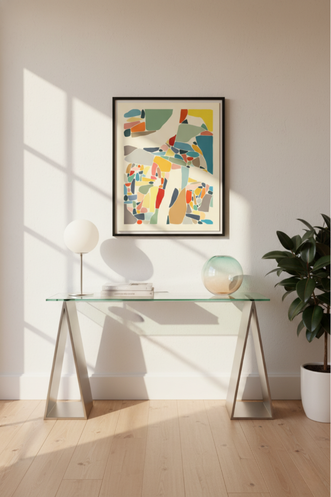 Esta obra abstracta parece un mosaico moderno donde cada forma y color tiene su propia historia. Con una paleta cálida y vibrante que incluye verdes, mostazas, azules, rojos y rosas, crea una sensación de movimiento y armonía al mismo tiempo. Ideal para darle vida a una sala, un pasillo o cualquier espacio que necesite dinamismo y estilo. 🧩💛