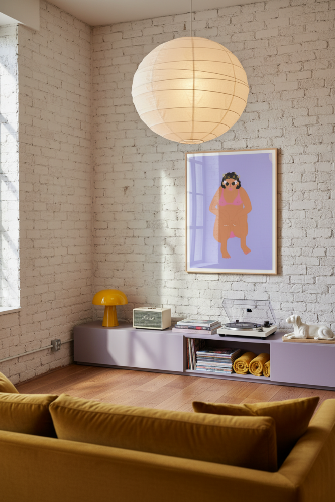 Esta ilustración celebra la diversidad corporal y el empoderamiento femenino con una figura en bikini rosa, sentada con total seguridad y actitud. Con una corona de flores en el cabello y lentes oscuros, irradia autenticidad, estilo y orgullo propio. El fondo lila potencia la vibrante energía del personaje, convirtiéndolo en un cuadro ideal para espacios relajados como una recámara, un baño moderno o un rincón que invite al amor propio.