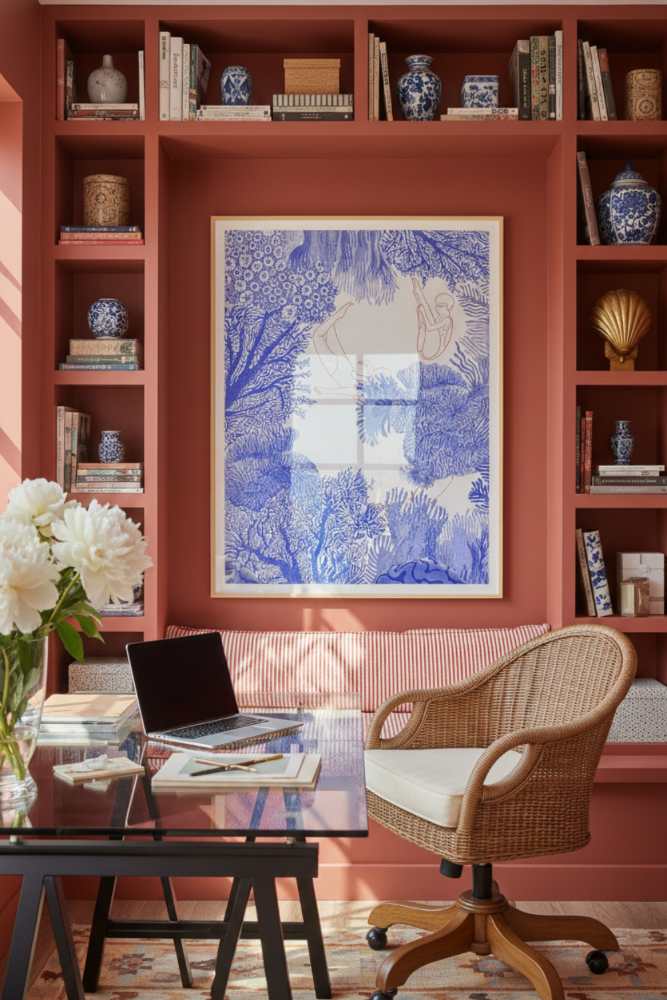 Este cuadro transmite la belleza serena del mundo submarino con un estilo delicado y etéreo. En tonos azules y lilas, se despliega un arrecife coralino lleno de textura, donde figuras femeninas en línea naranja flotan como si fueran parte del ecosistema marino. La obra combina elegancia y movimiento, ideal para quienes aman el arte botánico, el océano y las escenas oníricas. Perfecto para dar un toque sofisticado y poético a dormitorios o espacios de descanso.