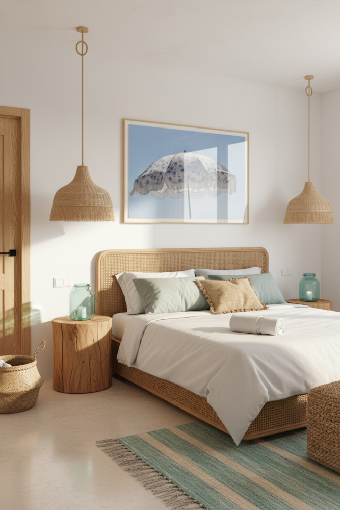 Este cuadro captura el encanto de una sombrilla estilo vintage con estampado floral azul sobre un cielo completamente despejado. La estética retro, con detalles de flecos y una paleta luminosa, evoca días de verano junto al mar con un toque nostálgico. Perfecta para decorar espacios con espíritu relajado y alegre, como una terraza, un rincón bohemio o un comedor con luz natural. 🏖️✨